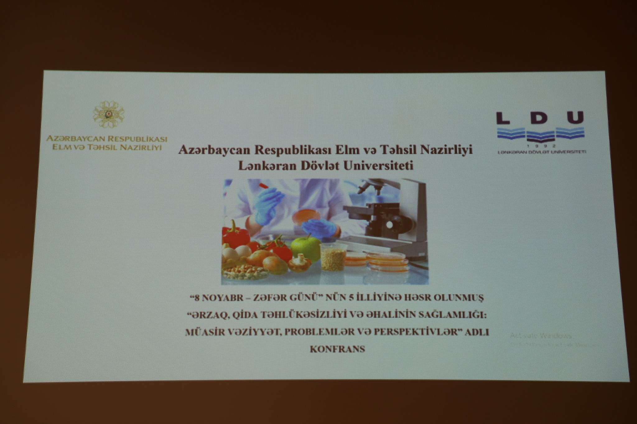Lənkəran Dövlət Universitetində (LDU) Lənkəran Şəhər İcra Hakimiyyəti ilə birgə "8 Noyabr-Zəfər Günü"nün 5 illiyinə həsr olunmuş elmi konfrans keçirilib. “Ərzaq, qida təhlükəsizliyi və əhalinin sağlamlığı: Müasir vəziyyət, problemlər və perspektivlər” mövzusunda keçirilən konfransın iştirakçıları ilk əvvəl Azərbaycanın ərazi bütövlüyü uğrunda canından keçən şəhidlərin xatirəsini 1 dəqiqəlik sükutla yad ediblər. Sonra Azərbaycan Respublikasının Dövlət Himni səslənib.